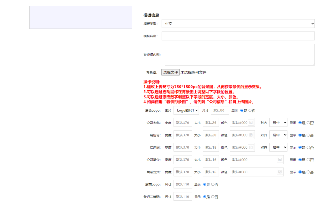 ➤ PS:可通过各种功能按钮,上传企业自制个性化背景图以及品牌Logo、输入欢迎词内容、调整字体大小等;在左侧预览界面内可拖动各个内容版块,自行设计。