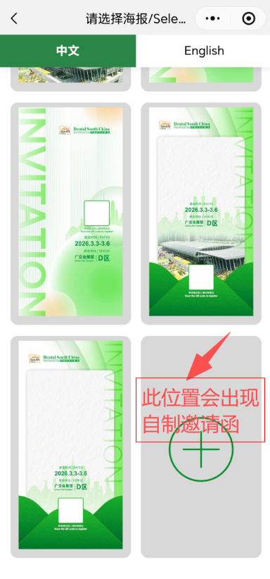 主办方审核通过后,回到小程序,选择自行设计的邀请函转发➤ 完成制作后,需等待主办方审核,审核完成后再次登陆“华南口腔展”小程序,即可在模版选择界面看到自己设计的邀请函模版。