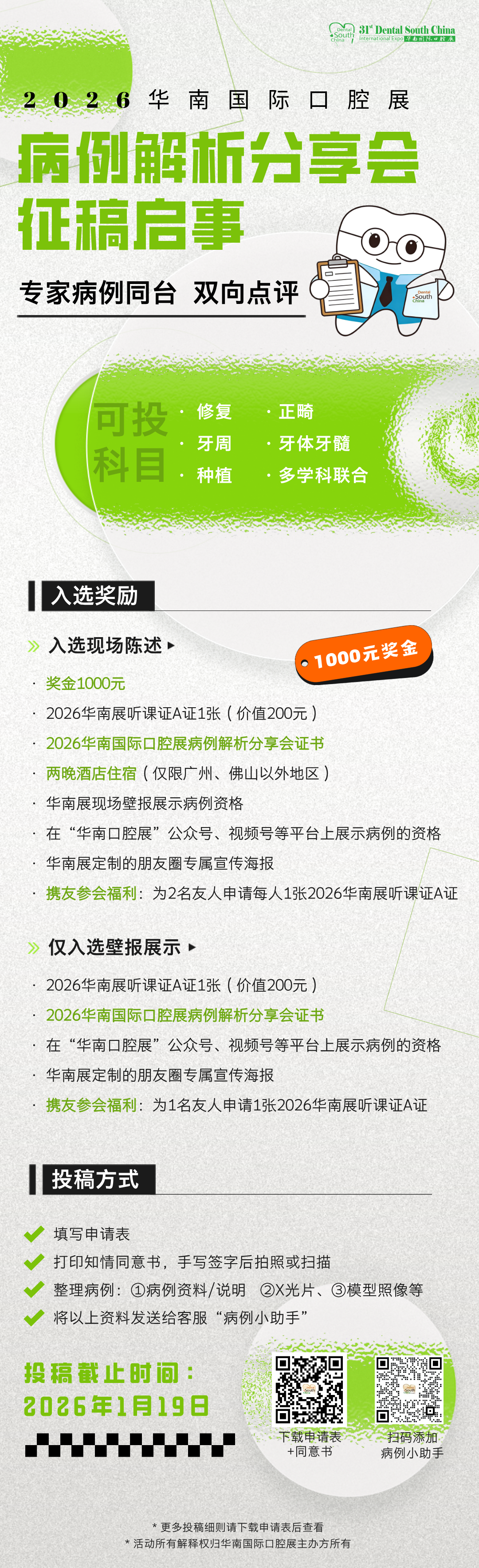 诚邀大家带着精心打磨的临床佳作,站上2026华南国际口腔展的舞台,与行业顶尖专家同台对话,一起精进诊疗思维!